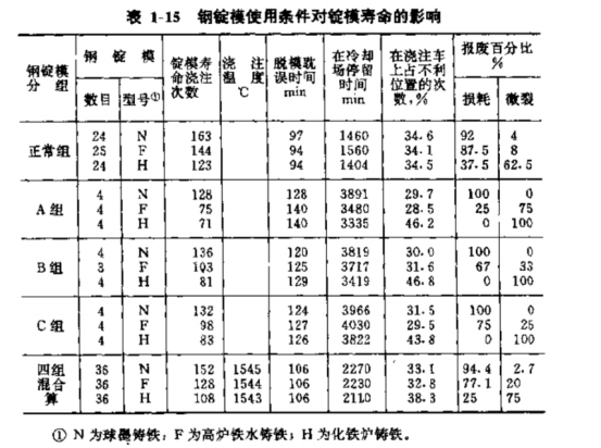 影響 鋼錠模 使用壽命的因素國內外許多工廠對 鋼錠模 使用條件的研究指出:澆注方法、澆注溫度、澆注速度、脫模時間、冷卻方式及鋼錠模周轉都對鋼錠模壽命有直接的影響,其中尤以脫模時間及冷卻方式影響 較 大。法國盧森堡阿爾貝德公司埃一舍夫朗日廠與比利時冶金研究中心共同合作研究鋼錠模使用條件對其壽命的影響,試驗把 108 個鋼錠模分為 4 組,每周澆注 6 次列為正常組,其他每周澆注 3 次的分為 A 、 B 、 C 三組,其試驗結果列于表 1 一 15 中。